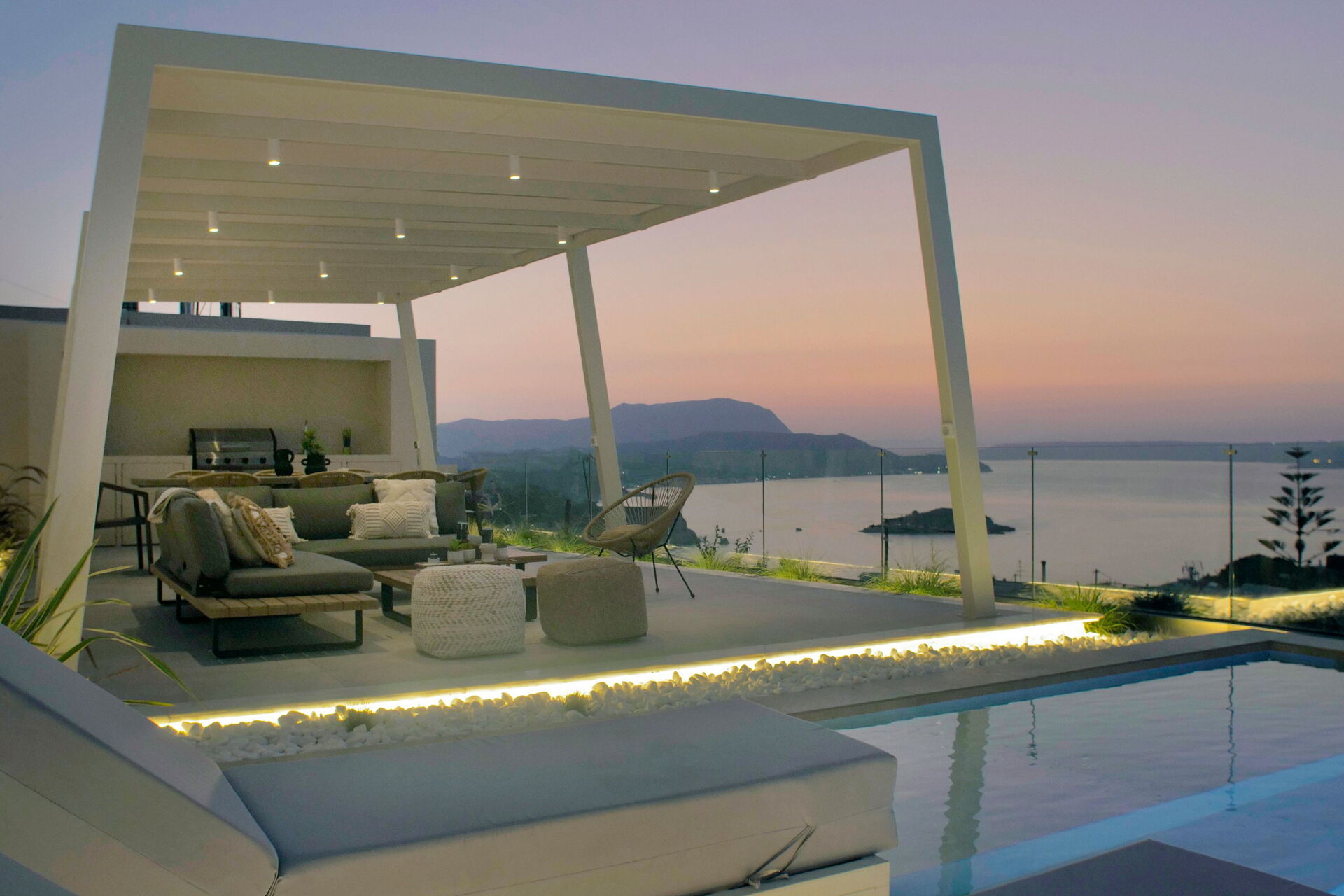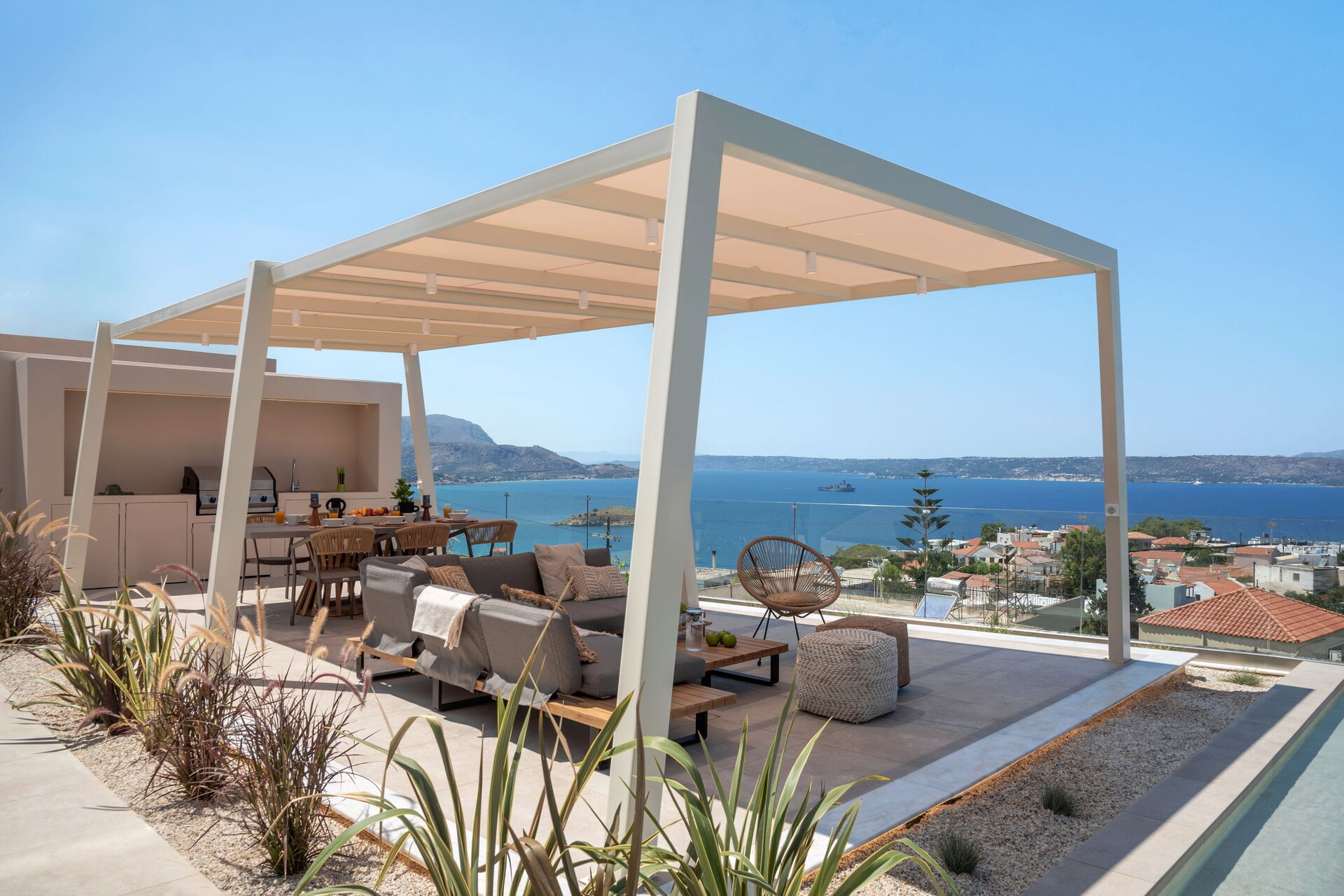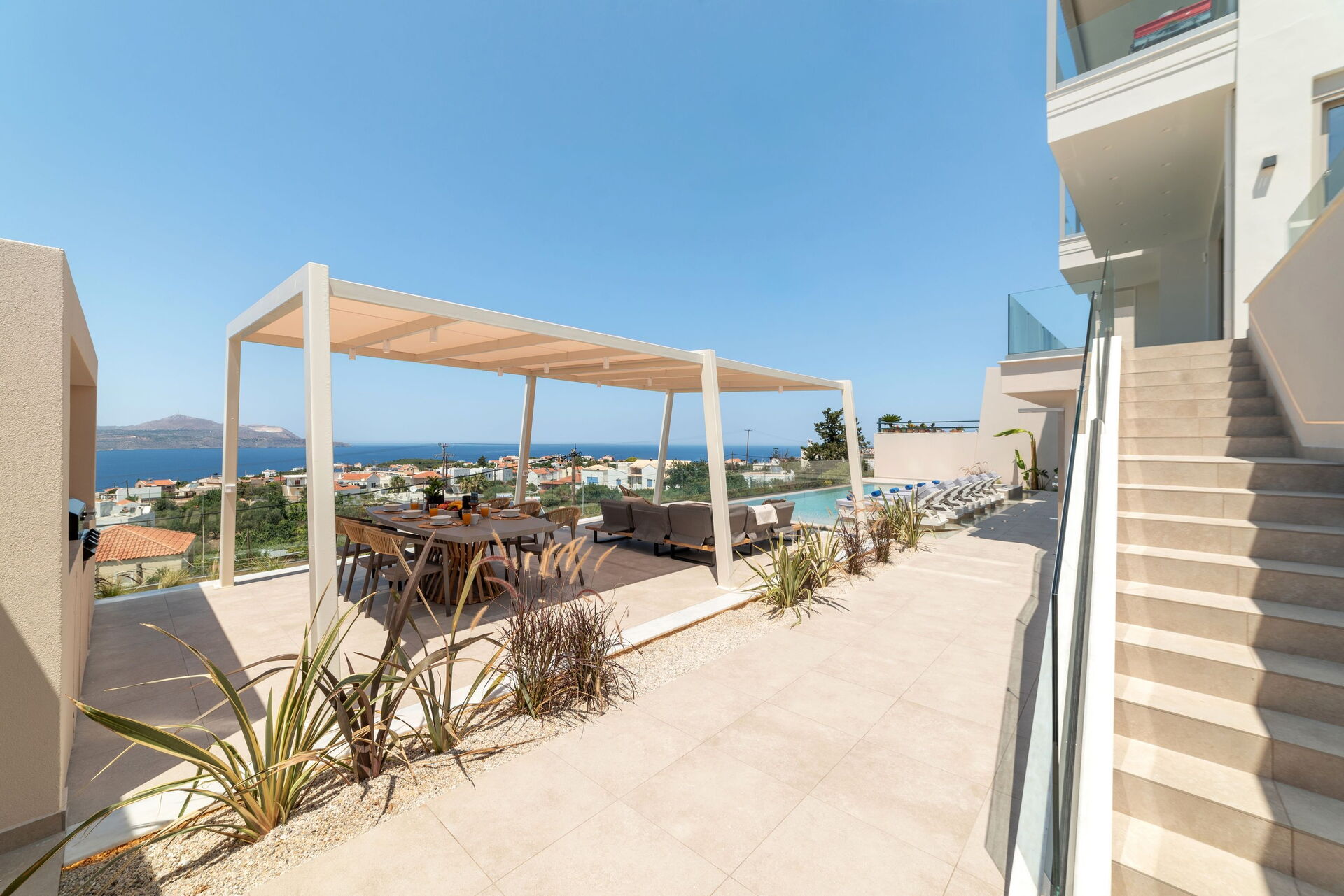 Seaview Lux è una porzione di villa con piscina privata situata in posizione panoramica nel paese di Plaka a Creta. Si sviluppa su un unico piano (al piano superiore si trova l’appartamento abitato dai proprietari) e può ospitare fino a 6 persone.